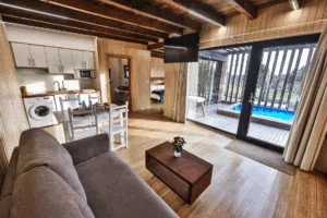 Todas las cabañas cuentan con TV, wifi, cocina equipada, chimenea y climatización, además de acceso a un parque infantil compartido. Y para los que se preocupan por el medio ambiente, estas cabañas son sostenibles, utilizando madera reciclada y energía verde. Si buscabas un plan original con jacuzzi privado, comodidad y una ubicación excelente, no te queda otra que pulsar «Reserva…». 🌿
