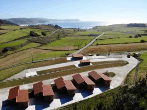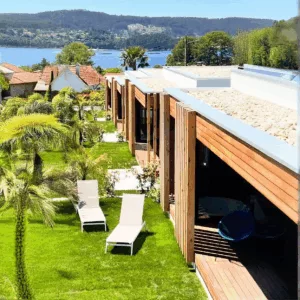 El complejo Cabañas de Xarás es una auténtica joya. Sus cabañas de madera ofrecen vistas impresionantes de la ría y puestas de sol de ensueño. Relájate en las terrazas con tumbonas y jacuzzi oculto, disfrutando de la Naturaleza circundante.