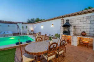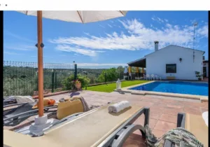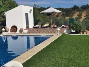 En el exterior, la piscina privada de 8×5 m cuenta con valla de seguridad infantil. El porche cubierto, camas balinesas, terrazas con sombra, barbacoa y zonas de descanso invitan a disfrutar del clima andaluz al aire libre. Ideal para familias o grupos que buscan tranquilidad con fácil acceso a dos grandes ciudades. ¡Ven y sumérgete en la belleza natural de la Casa Rural Los Mellizos! 🌳