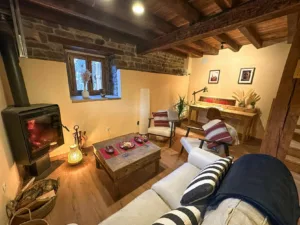 Esta acogedora casa pasiega de piedra y madera ofrece un refugio con todas las comodidades, incluyendo dos dormitorios, un espacioso salón con estufa de fuego, cocina pasiega de obra y un porche cubierto con barbacoa.