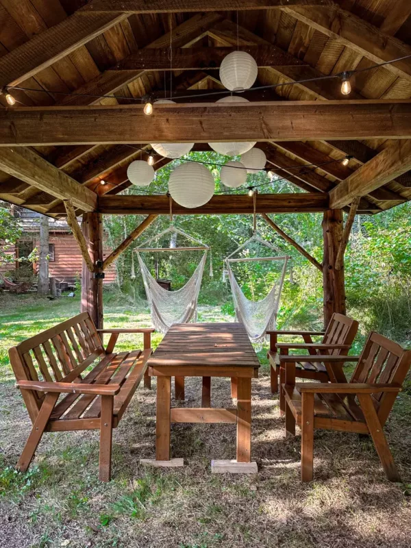 Sielska Chyża to trzy klimatyczne domy położone na 58-hektarowej działce w bieszczadzkiej wsi Rzepedź. Otaczają je dzikie łąki przypominające połoniny i setki hektarów lasów, które zachęcają do spacerów o każdej porze roku. To miejsce dla tych, którzy pragną prawdziwej ciszy – z dala od zgiełku, blisko Natury i lokalnej historii. Doskonale sprawdzi się zarówno na samotny reset, jak i kameralne spotkania z przyjaciółmi przy wspólnym ognisku lub długich rozmowach przy kominku.