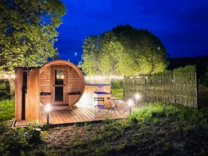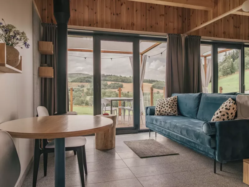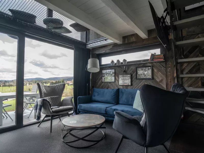 Z tarasu wskoczycie prosto do podgrzewanego jacuzzi, a tuż obok czeka sauna i chłodna beczka do zanurzenia. Wokół – cisza, świerki i widok na łagodnie pofalowane wzgórza. To miejsce idealne na leśne kąpiele, rowerowe wyprawy po okolicy i chwile tylko dla siebie. Jeśli szukacie ucieczki od zgiełku – tu znajdziecie dokładnie to, czego potrzeba.