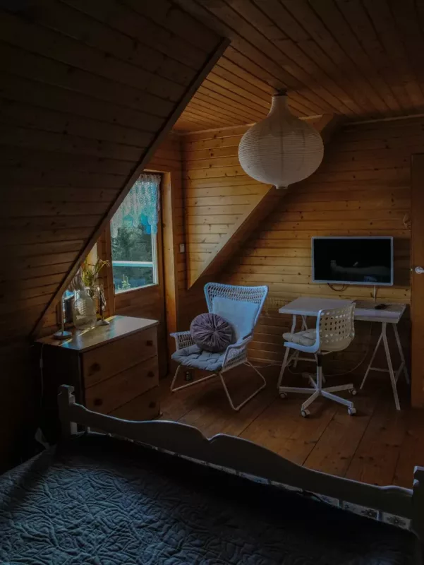 W większym domu (dla 8 osób) czeka na Ciebie kominek, artystyczna pracownia, dwie duże sypialnie i tarasy. Mniejszy domek (dla 2–3 osób) to idealna przestrzeń dla pary z dzieckiem lub samotnika szukającego ciszy i inspiracji. Oba otacza duży ogród z miejscem na ognisko, jogę 🧘 i piknik.
