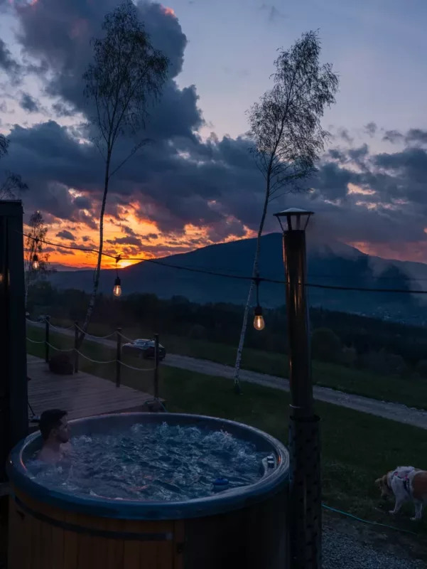 Po dniu spędzonym na górskich szlakach lub zwiedzaniu Sanoka i słowackich Medzilaborec, można zrelaksować się w saunie z panoramicznym widokiem, zanurzyć w jacuzzi pod gwiazdami albo odpocząć przy tężni. Dzieci, dorośli i psi towarzysze znajdą tu wspólne miejsce do zabawy i wyciszenia. 🌲
