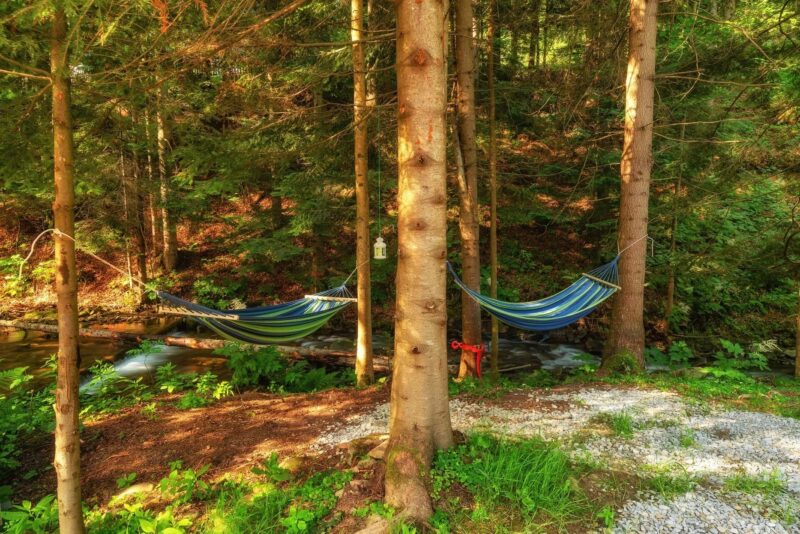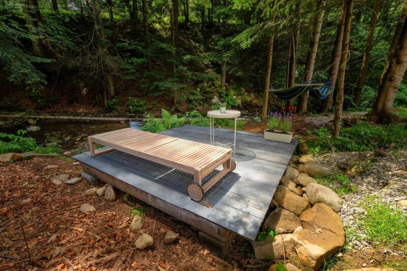 Domki znajdują się obok czystego babiogórskiego lasu. Znajdziecie tu leśną strefę relaksu z drewnianym tarasem i hamakami, zawieszonymi między drzewami. Co więcej, nieopodal Zawoi 1725 przepływa leśny strumyk. To naprawdę malownicza okolica.