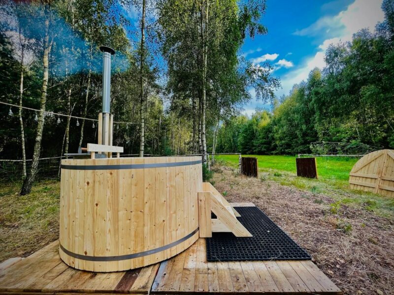 W pobliżu domków czeka na Was relaks w ogrodzie z sauną. Dodatkowo każdy domek posiada drewniany taras i miejsce na grilla, a na terenie Polany Glamp znajdziecie również ruską banię. Szczególnie polecamy wziąć nocną kąpiel pod gwiazdami. 🌟