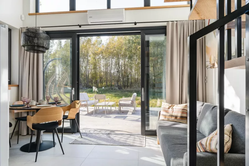 W otoczeniu przyrody, nad rzeką i na dodatek niedaleko plaży – Domki Momenty dzieli od Morza Bałtyckiego jedyne 4,5 kilometra, dlatego możecie połączyć różne rodzaje aktywności podczas jednego urlopu. Nadmorskie spacery o blasku księżyca czy leniwe popołudnie ze świeżo mieloną kawą na tarasie – tutaj każdy moment jest wyjątkowy.