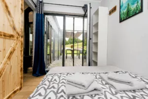 Wnętrza Stodoły są przestronne i przytulne, a duże przeszklenia pozwalają cieszyć się widokiem Natury o każdej porze dnia. Wieczorami można zrelaksować się przy kominku lub na tarasie, podziwiając gwieździste niebo i wsłuchując się w dźwięki otaczającej przyrody.