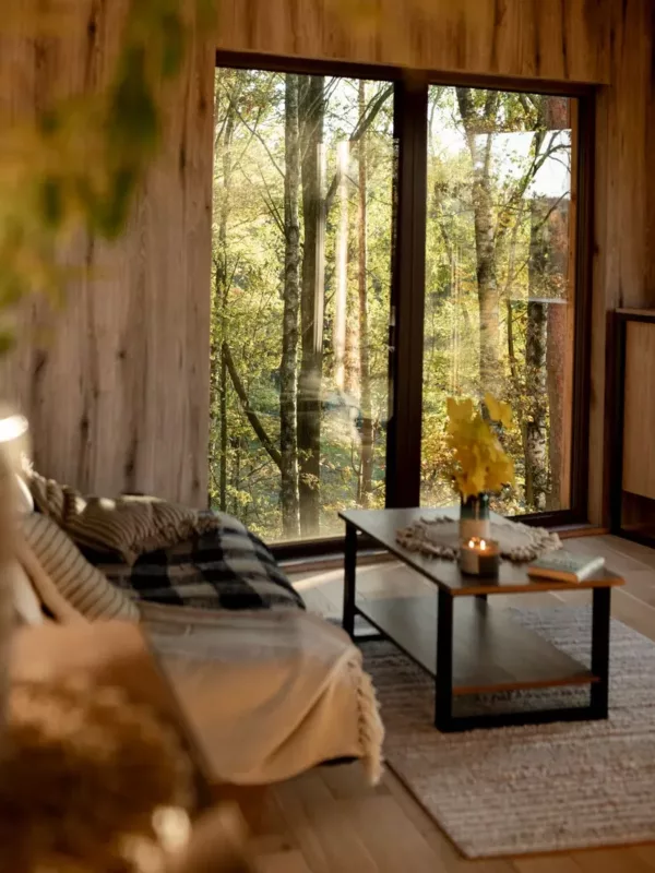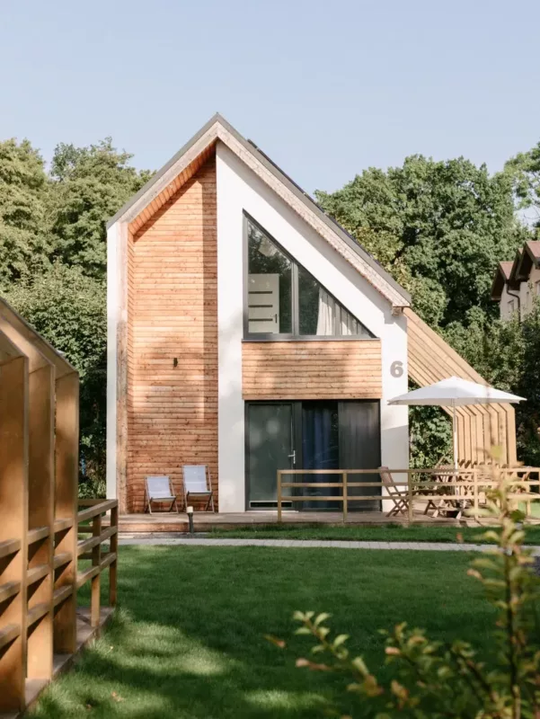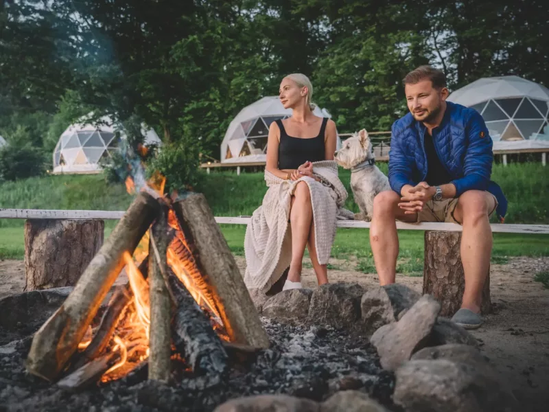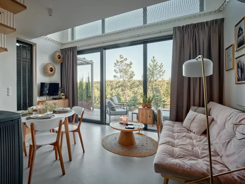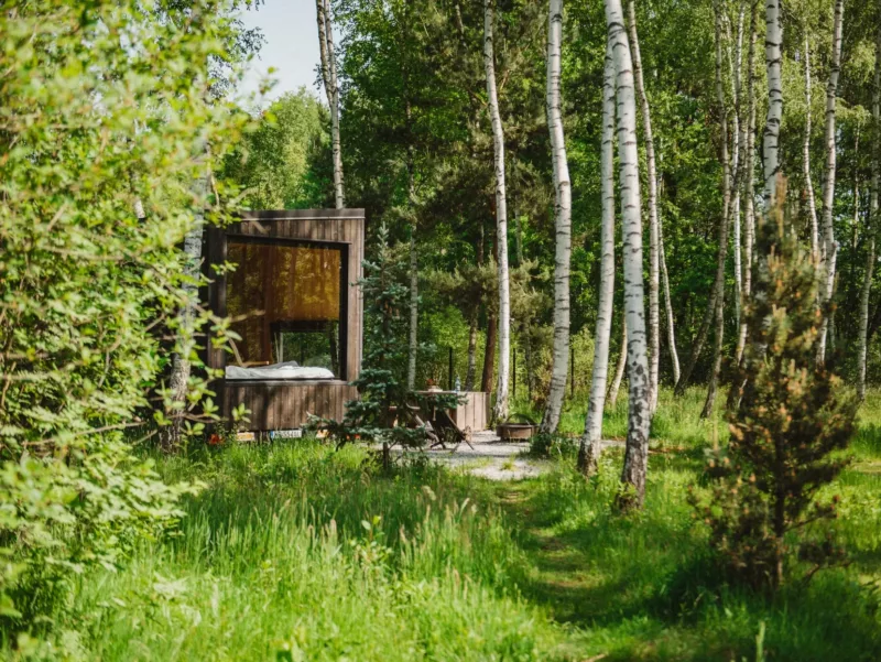 Domki inspirowane są energią żywiołów bowiem zaprojektowane są tak, by wspierać uważność, spokój i komfort. Z panoramicznych okien widać drzewa, w wannie można zanurzyć się z widokiem na las, a wieczorem – podziwiać gwiazdy. Obok czeka sauna, ścieżki spacerowe i przestrzeń do medytacji. To miejsce stworzone z myślą o tych, którzy chcą zwolnić, zanurzyć się w Naturze i spędzić czas z pupilem w prawdziwie spokojnym rytmie.