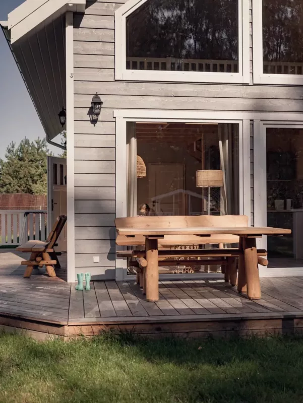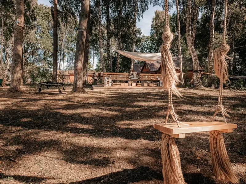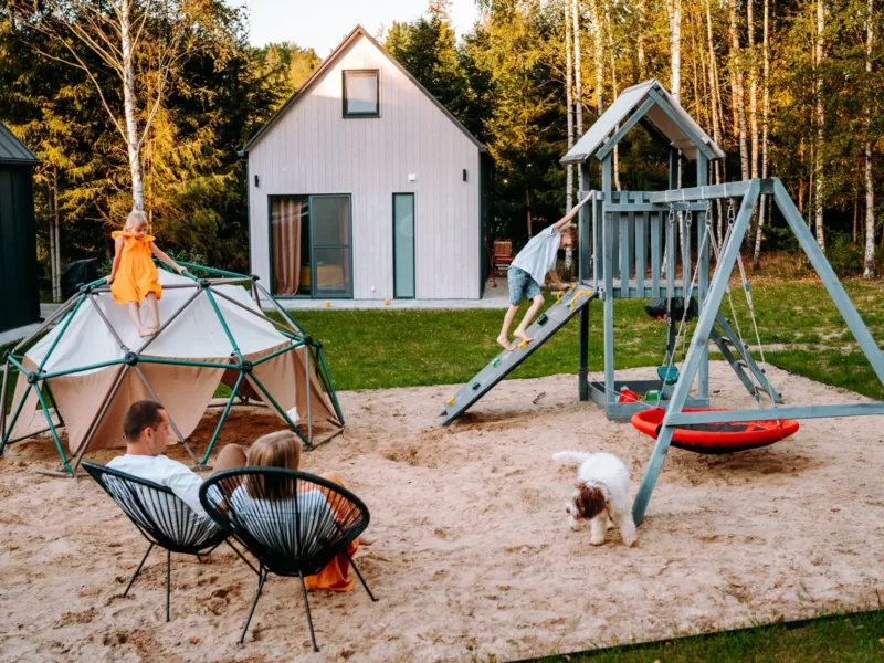 Wnętrza kuszą naturalnym drewnem, miękkim światłem i detalami, które sprawiają, że czujesz się jak w domu. Zamiast telewizora – książki i planszówki, zamiast zgiełku – śpiew ptaków i zapach lasu. Dzieci mają tu swój własny świat: ogromną piaskownicę, huśtawki i domek z tarasem. A wieczorem? Seans w saunie i rozmowy na tarasie pod brzozami. 🌿