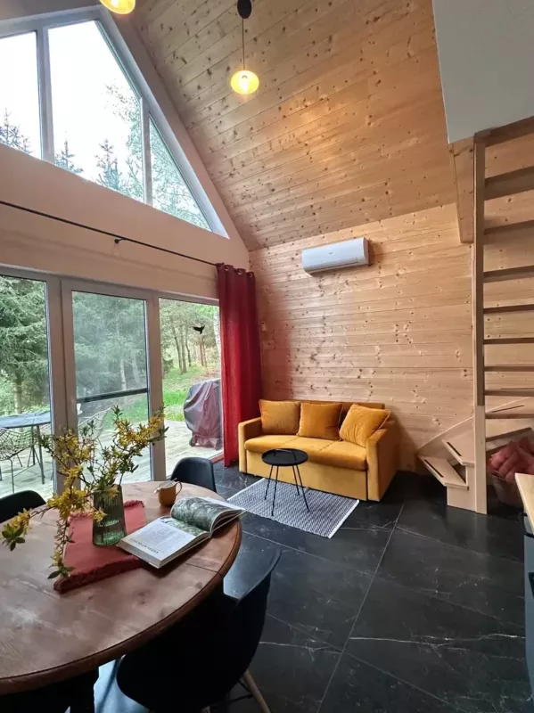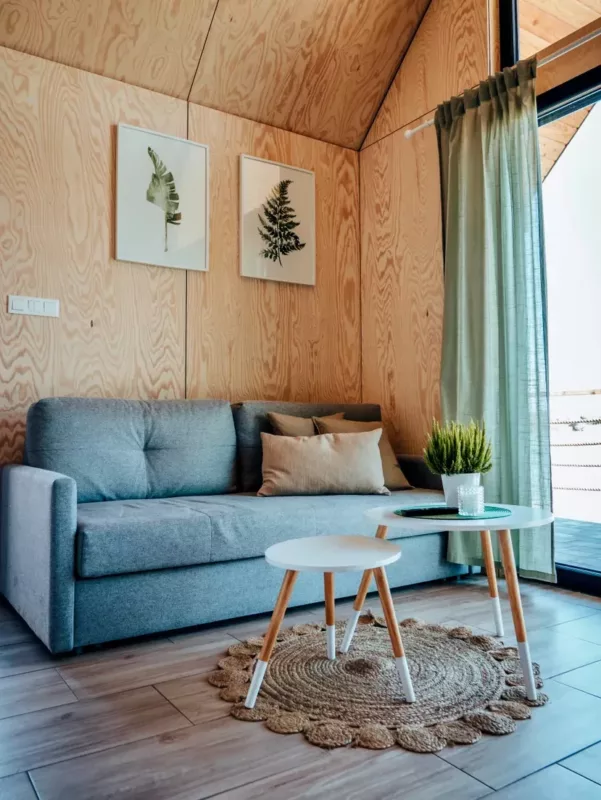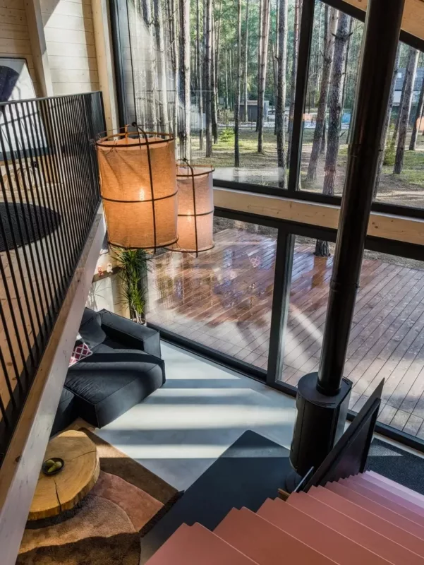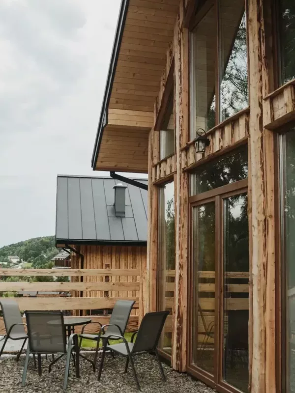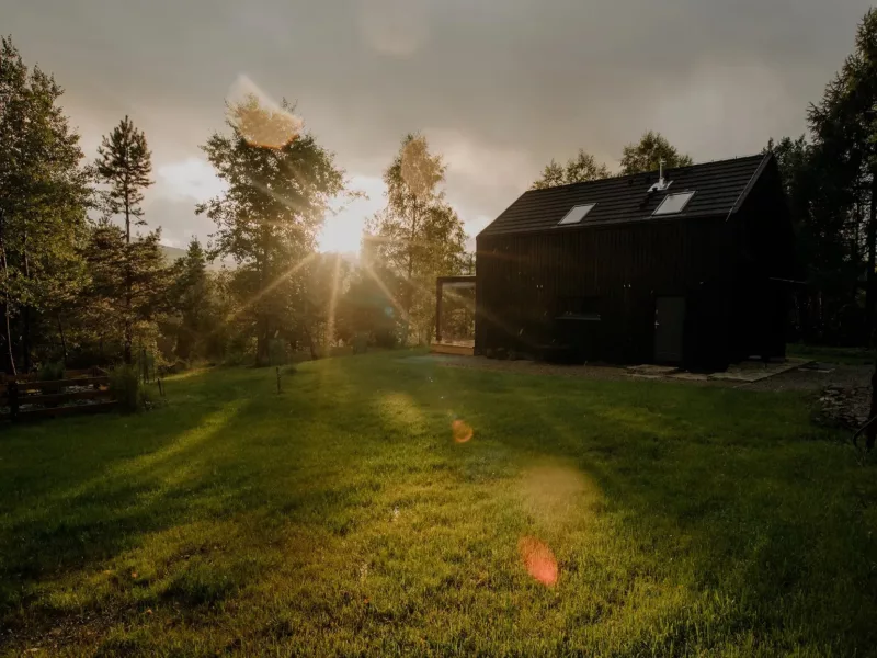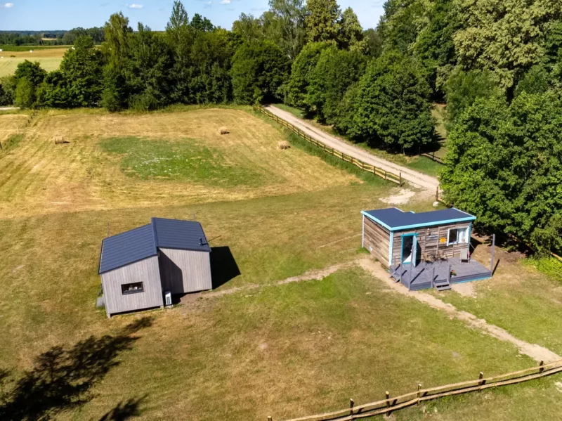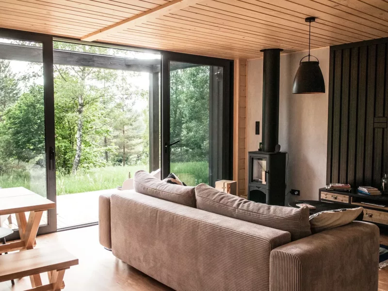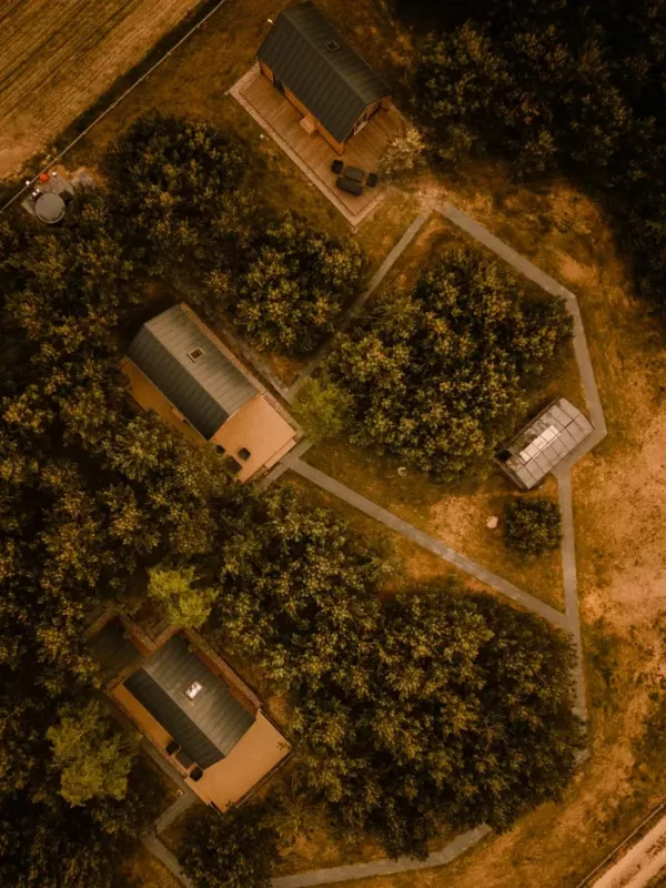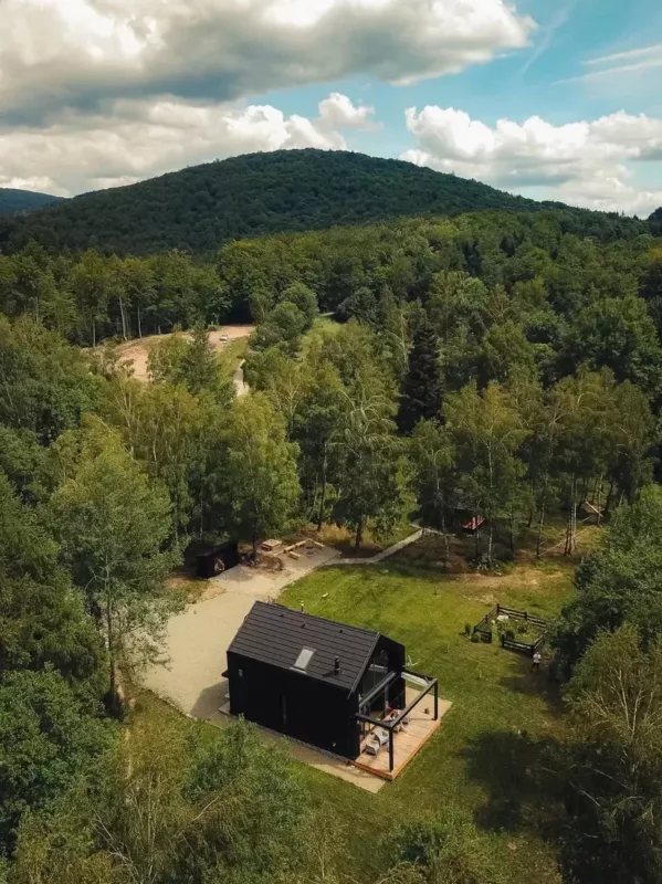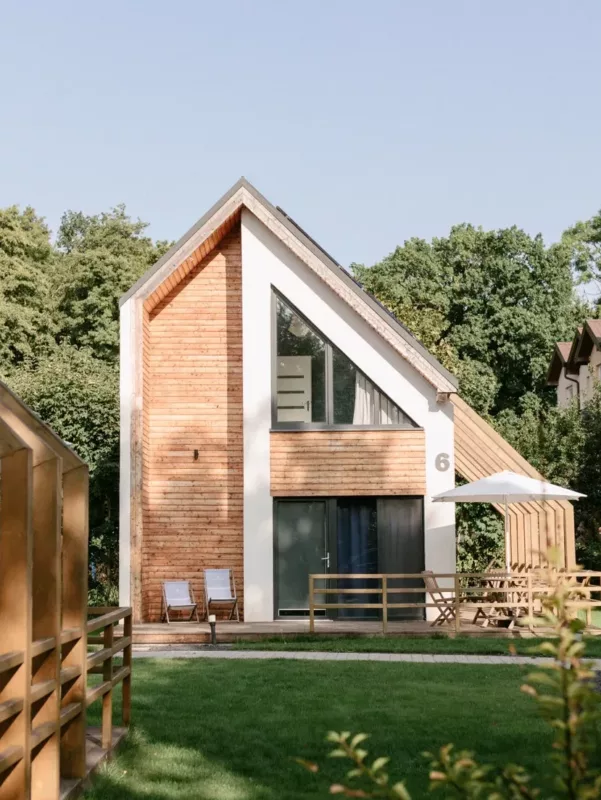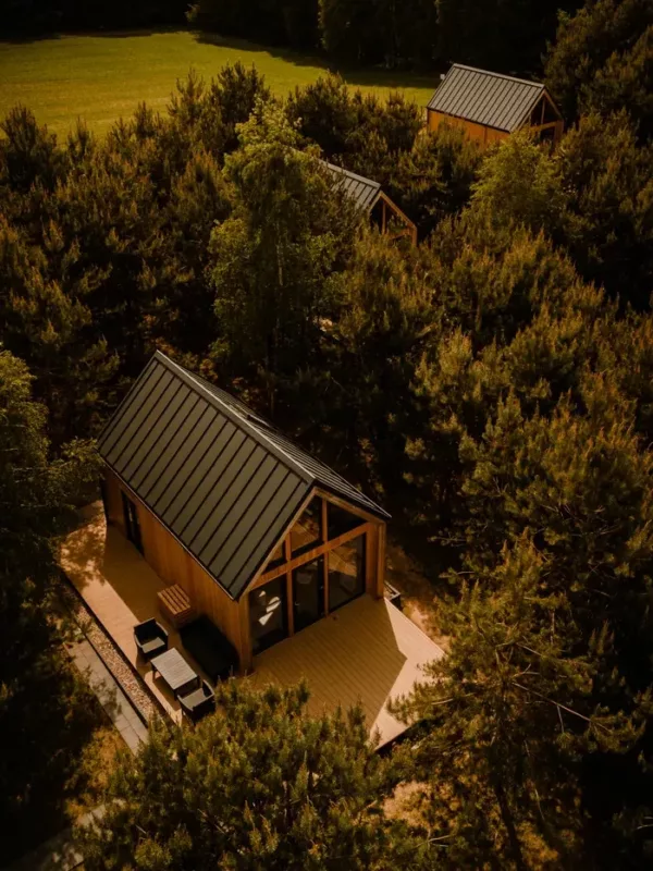 Każdy domek ma zapewnioną intymność dzięki otaczającej go roślinności i zacisznym zakątkom do odpoczynku. Na środku terenu znajduje się przeszklona oranżeria z kominkiem i długim, jesionowym stołem – idealna na wspólne śniadania czy wieczorne rozmowy.