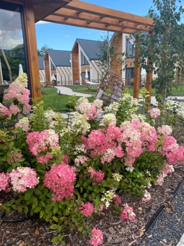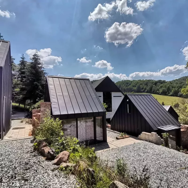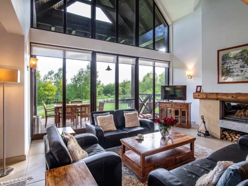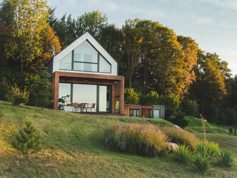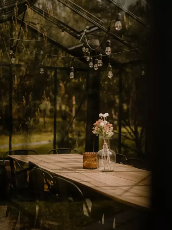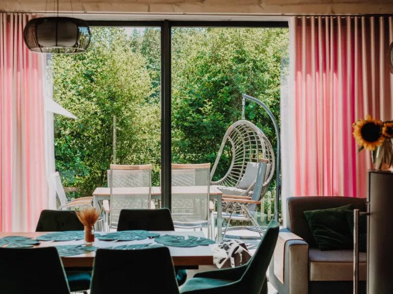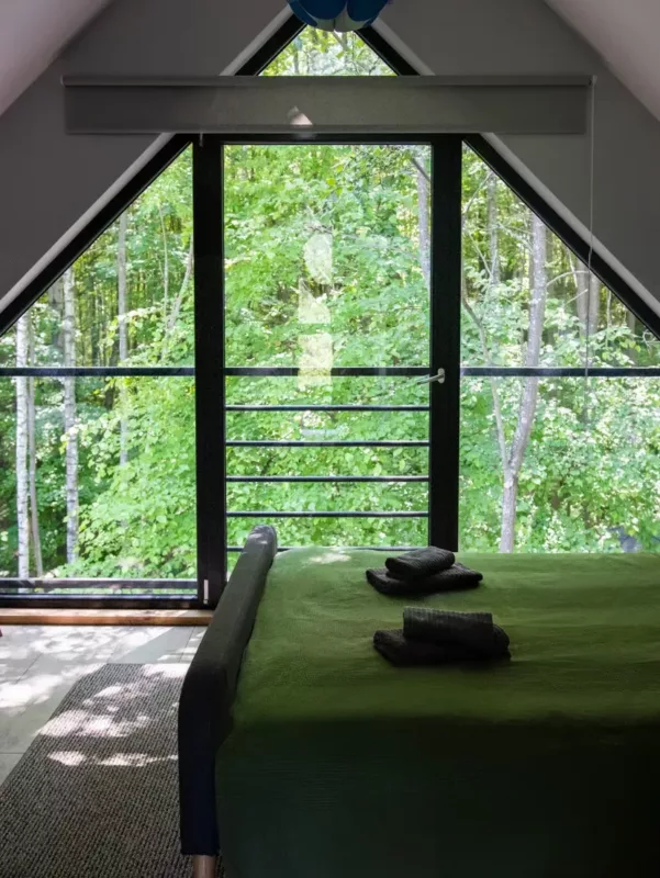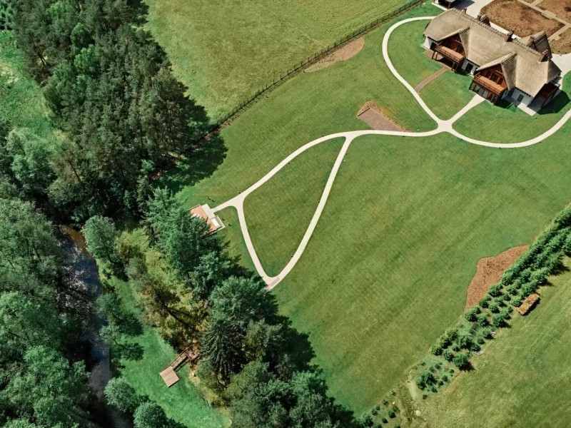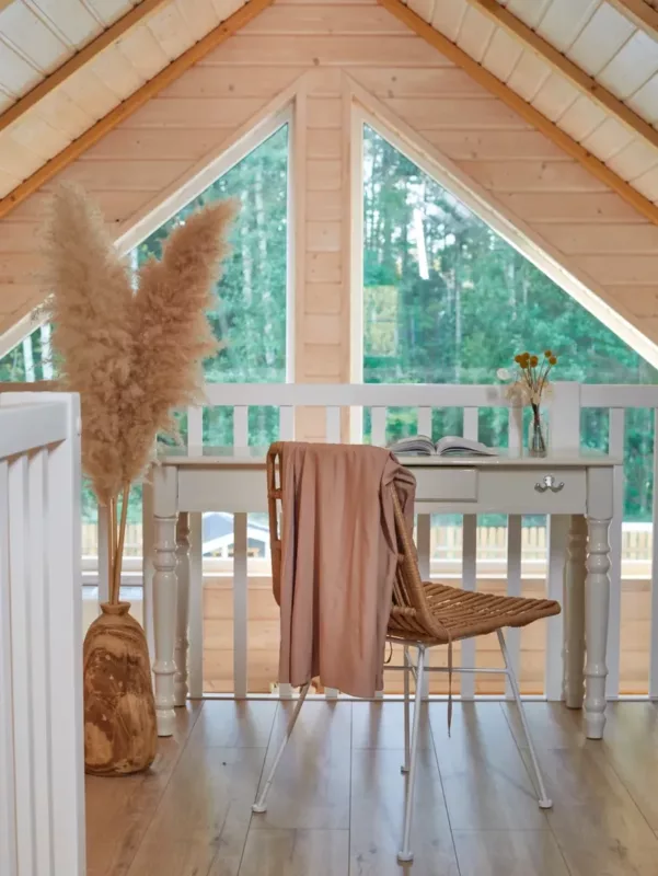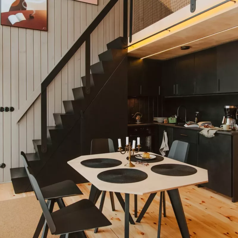 Każdy domek ma zapewnioną intymność dzięki otaczającej go roślinności i zacisznym zakątkom do odpoczynku. Na środku terenu znajduje się przeszklona oranżeria z kominkiem i długim, jesionowym stołem – idealna na wspólne śniadania czy wieczorne rozmowy.