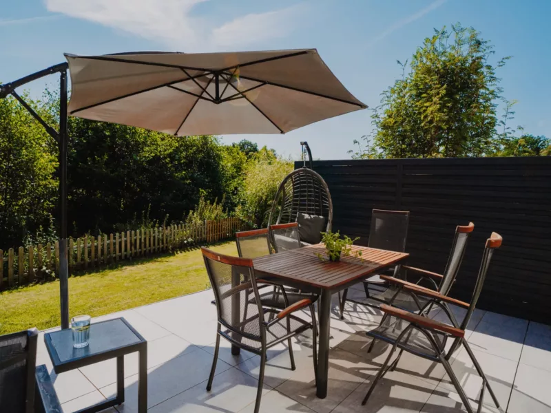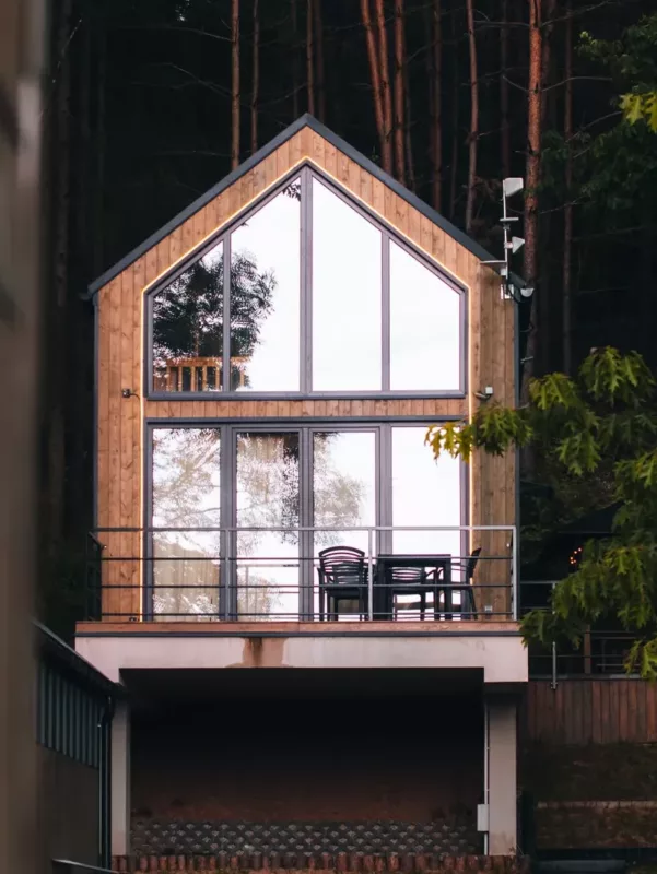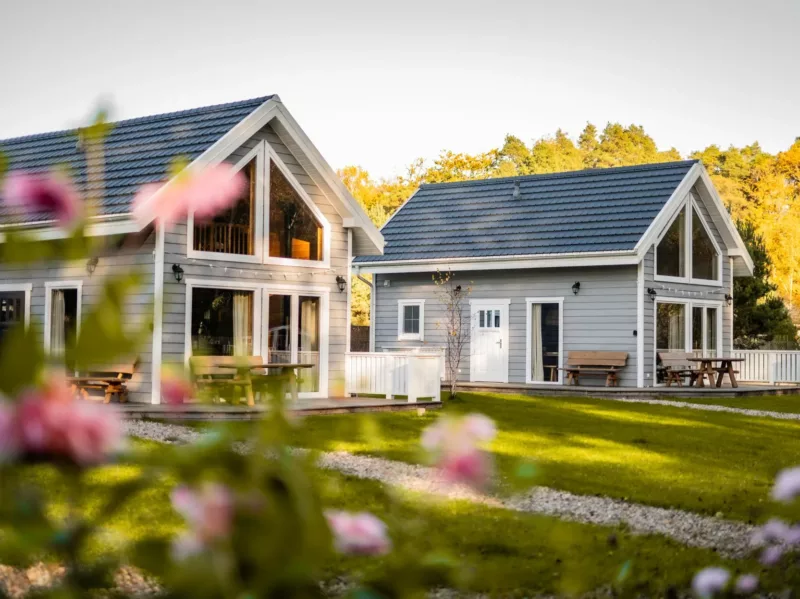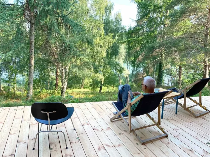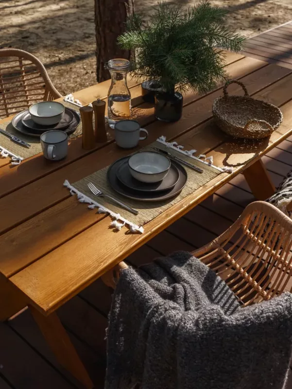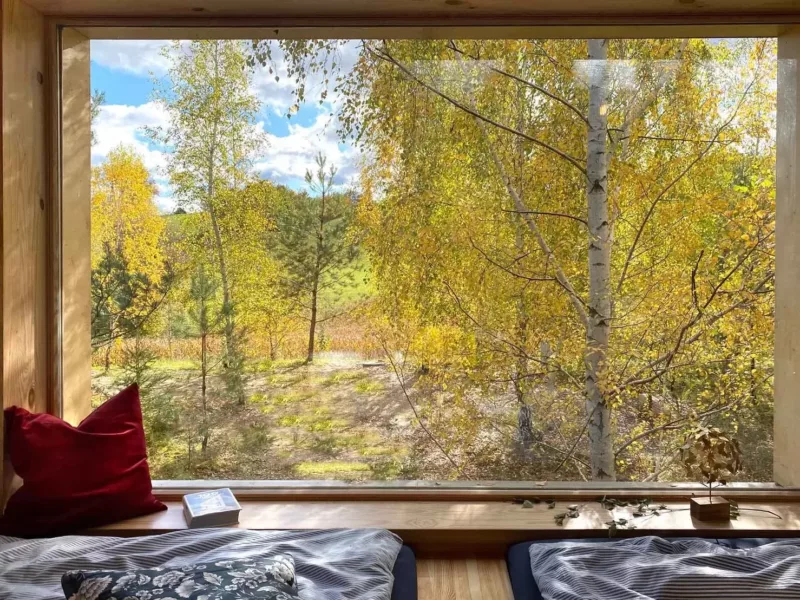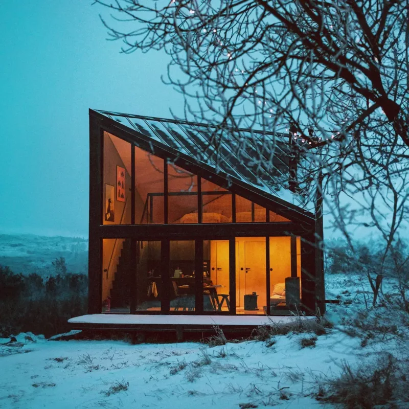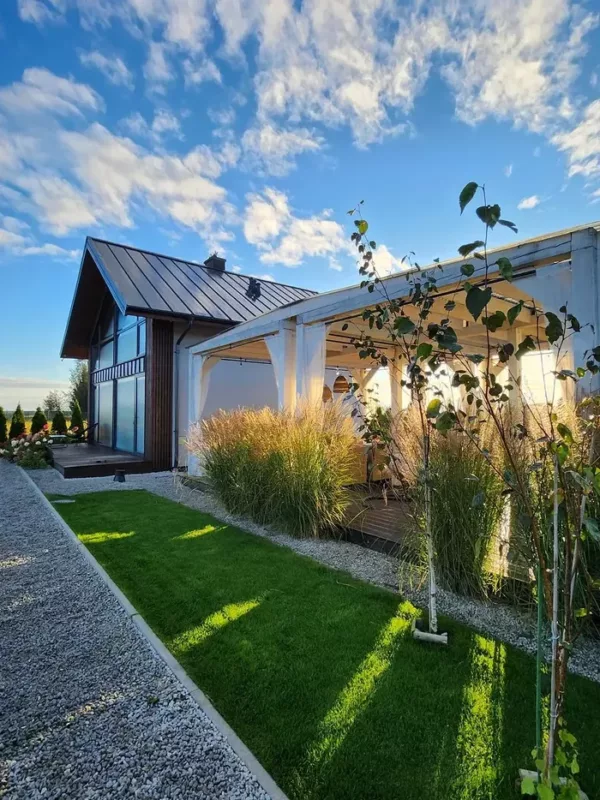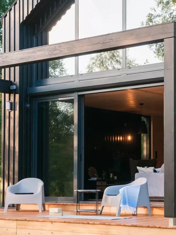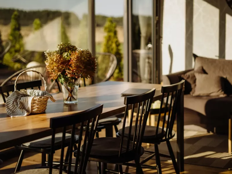 Każdy domek ma zapewnioną intymność dzięki otaczającej go roślinności i zacisznym zakątkom do odpoczynku. Na środku terenu znajduje się przeszklona oranżeria z kominkiem i długim, jesionowym stołem – idealna na wspólne śniadania czy wieczorne rozmowy.