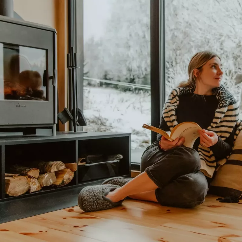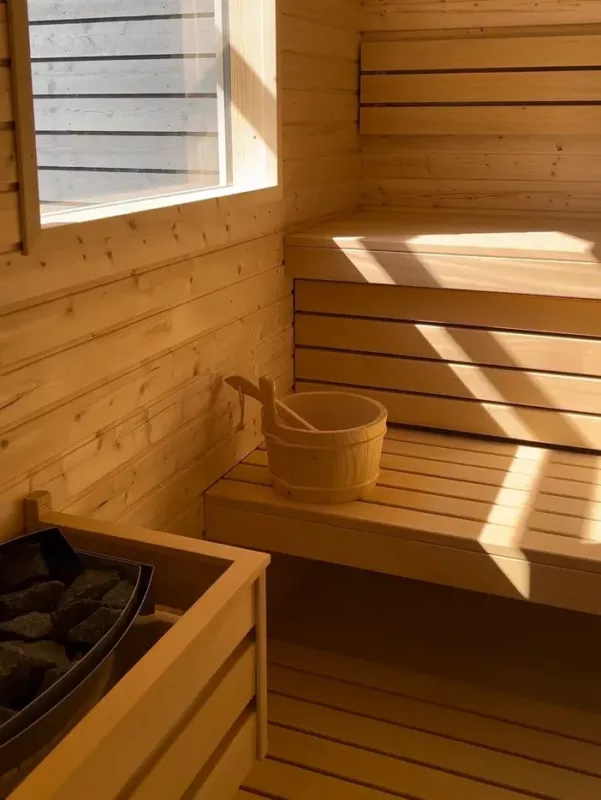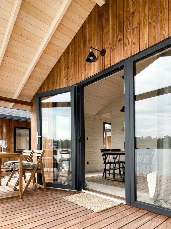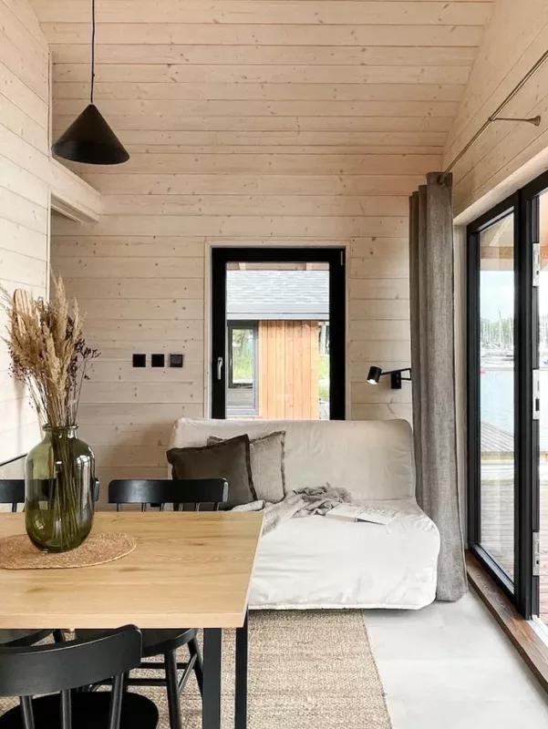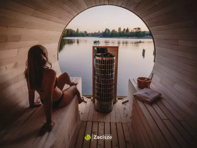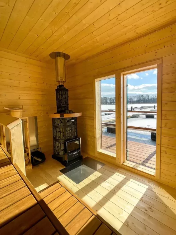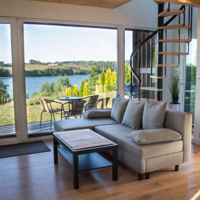 Na dole znajdziesz przytulny salon z aneksem kuchennym, sypialnię i łazienkę, a na antresoli – miejsce do spania dla czworga. Najlepsze jednak dzieje się na zewnątrz: kąpiele w jeziorze, wędkowanie, a wieczorami… prywatna sesja w saunie i jacuzzi pod gołym niebem.