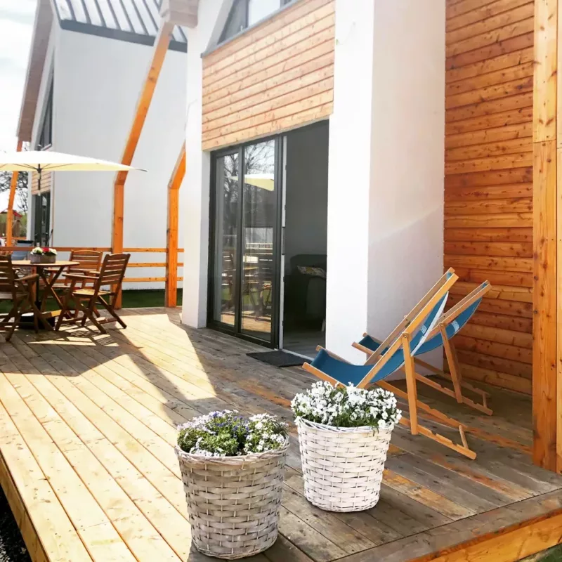 Już samo położenie domków zachęca do spędzenia wolnego czasu w ciekawy sposób. Są sporty wodne i leżaki na plaży, 🏖️ prywatna strefa z tarasem i leśny teren rekreacyjny z naturalnym placem zabaw. Nawet wycieczki rowerowe wyglądają tutaj zupełnie inaczej. W tak magicznej okolicy nie będziecie się nudzić – w końcu morze daje nieskończenie wiele możliwości.