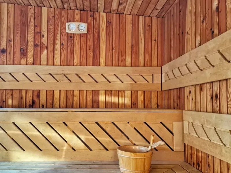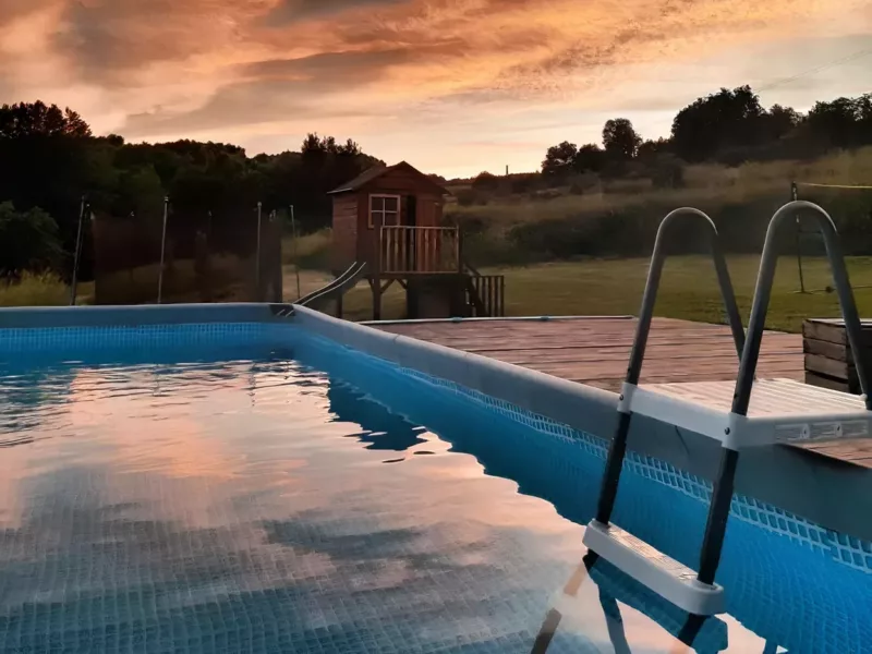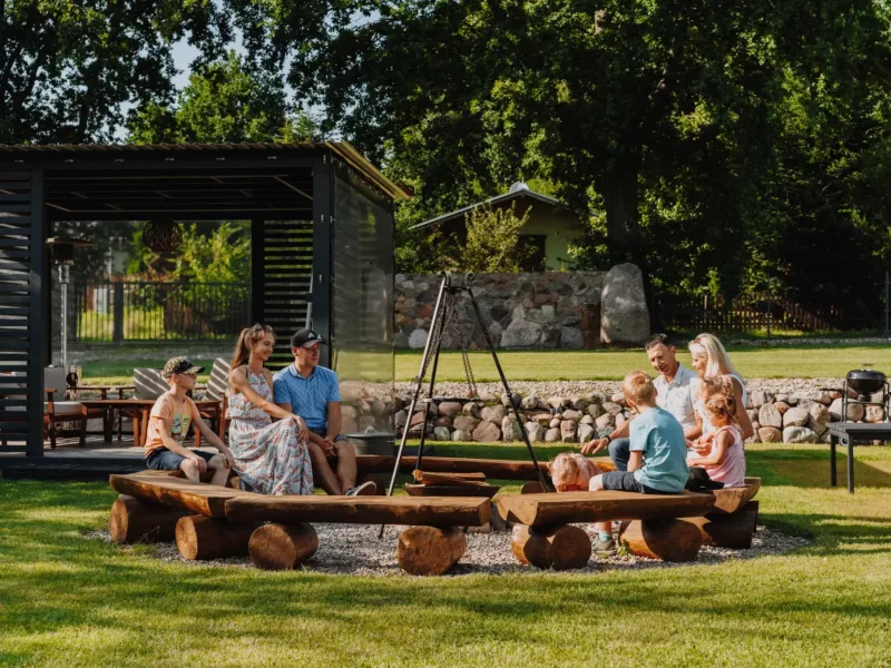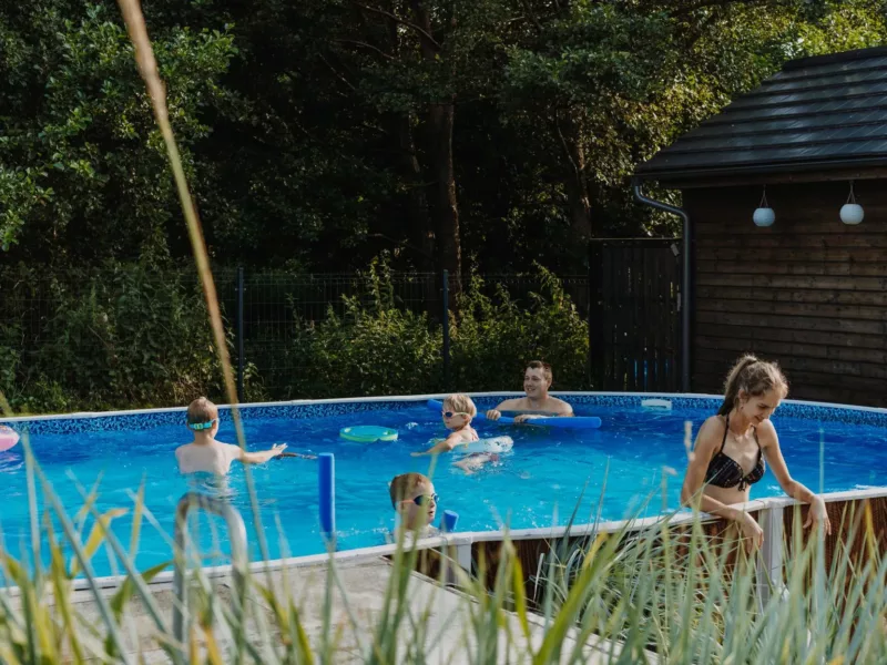 Na dzieci czekają plac zabaw z piaskownicą, trampolina i boisko do siatkówki na miękkim piasku. Rodzice mogą w tym czasie odpocząć w wygodnej wiacie z widokiem na plac. Goście mają też dostęp do dużego, podgrzewanego basenu oraz sauny. To miejsce stworzone z myślą o komforcie i beztrosce – dla dużych i małych.