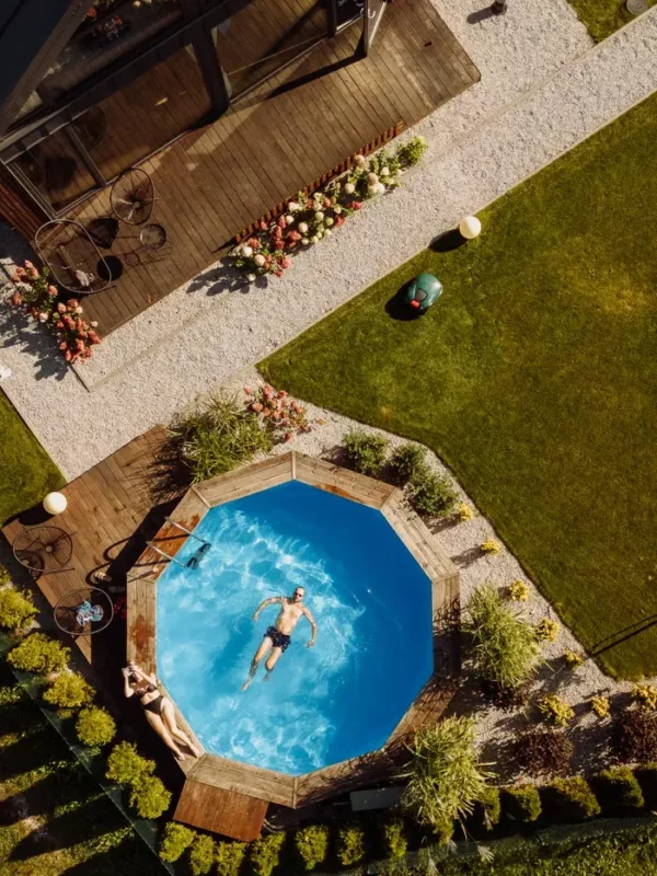 Na zewnątrz czeka ogród, letni basen z podgrzewaną wodą, gorąca balia oraz plenerowe kino – idealne warunki do relaksu. Drewniany taras podzielono na kilka stref wypoczynkowych. Aby każdy znalazł tu swoje miejsce: na kawę, książkę, drzemkę lub po prostu – by nasycić się ciszą. Kawałek Nieba to przestrzeń, w której naprawdę można odetchnąć.
