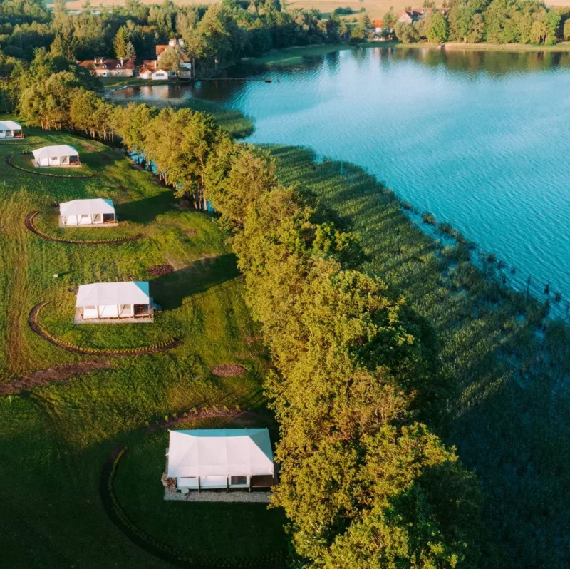 Każdy z namiotów został urządzony z myślą o wygodzie i estetyce – z prywatną łazienką, w pełni wyposażoną kuchnią i tarasem do celebrowania poranków. Na miejscu czekają dwie plaże, prywatny dostęp do jeziora, sprzęt wodny bez dodatkowych opłat, ścieżki spacerowe i miejsca na ognisko. Glamping zarządzany jest zdalnie, ale opiekunowie troszczą się o to, by każdy pobyt był niezapomniany. Jeśli szukasz czegoś naprawdę innego, Masuria Lakehouse to idealna propozycja.