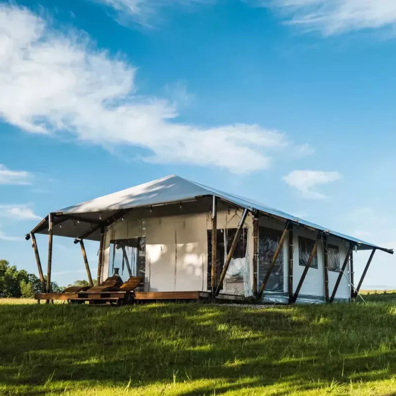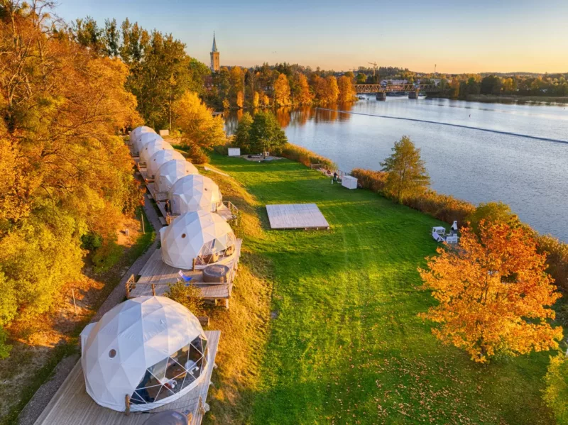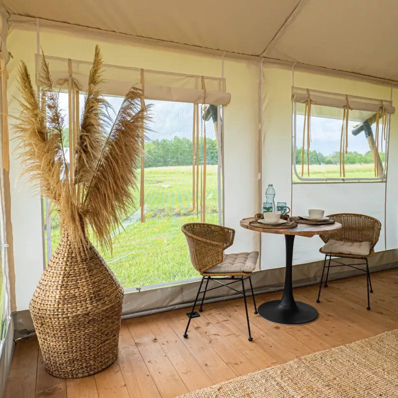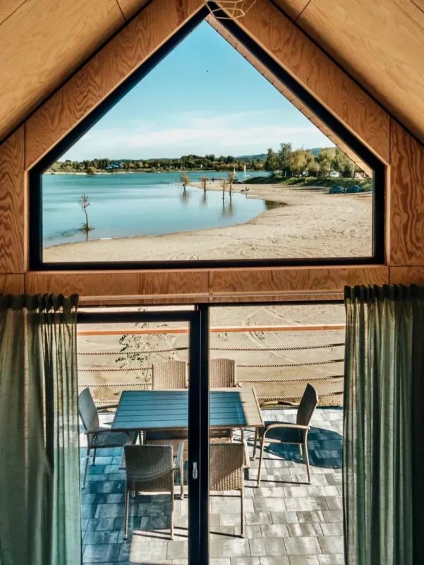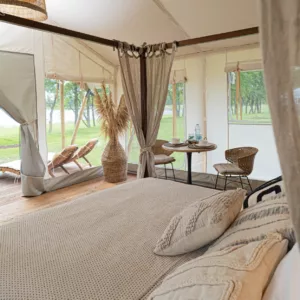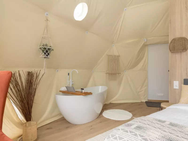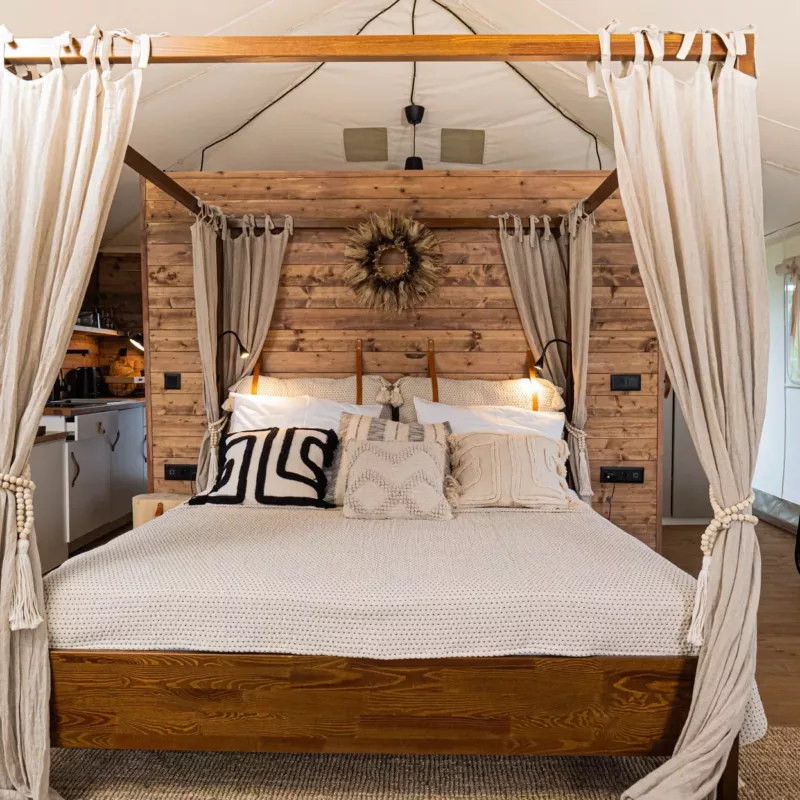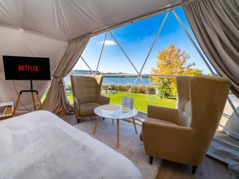 Każdy z namiotów jest całoroczny, wodoodporny i dobrze izolowany, z prywatną łazienką, smart TV, klimatycznym oświetleniem i aneksem kuchennym. Okna wychodzą wprost na taflę jeziora, a wieczorne światło zachodu tworzy atmosferę, którą trudno zapomnieć.To idealne miejsce na odpoczynek tylko we dwoje – o każdej porze roku.