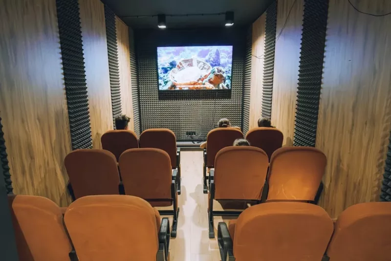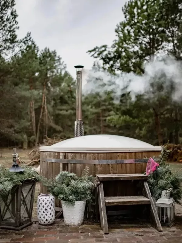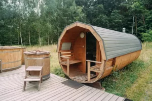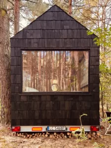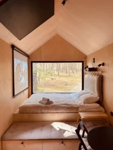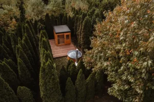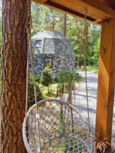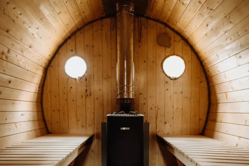 W środku czeka m.in. sauna, biblioteczka, planszówki, winyle i projektor z dostępem do Netflixa – wszystko, co potrzeba do klimatycznego wieczoru z przyjaciółkami. Ponadto możecie wynająć mobilną balię z jacuzzi i zorganizować wyjątkowy wieczór z widokiem na drzewa i niebo pełne gwiazd.