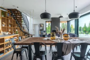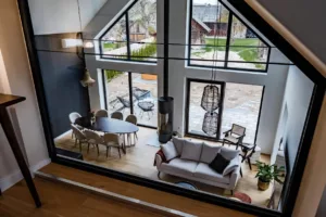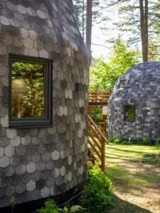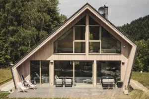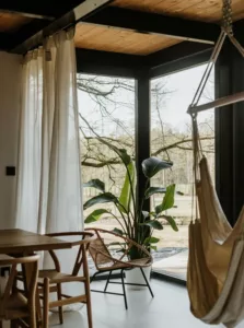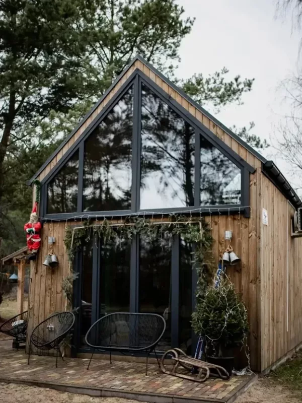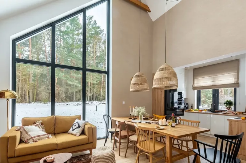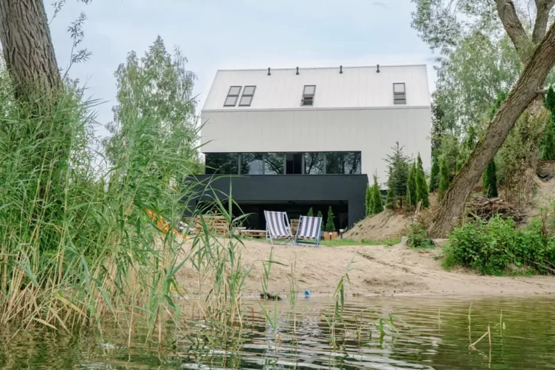 Naszą listę propozycji zaczynamy od Dzielnika Bez reszty – domu zanurzonego w lesie, zaledwie 70 km od Warszawy, ale jakby w zupełnie innym świecie. Położony na skarpie, otoczony drzewami i wtapiający się w leśny krajobraz, oferuje ciszę, intymność i niepowtarzalną atmosferę. Co więcej, ogromne przeszklenia sprawiają, że Natura 🌲 zagląda tu do środka o każdej porze dnia i nocy.