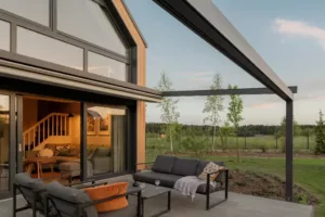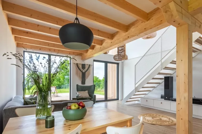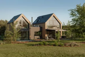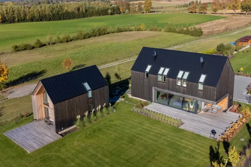 Dom pomieści do 10 osób, z możliwością dostawek, a z jednej z sypialni można urządzić gabinet z widokiem na zieleń. Ponadto otwarta kuchnia i jadalnia sprzyjają wspólnemu gotowaniu i długim rozmowom przy winie. To idealne miejsce na świętowanie w naturalnym rytmie.