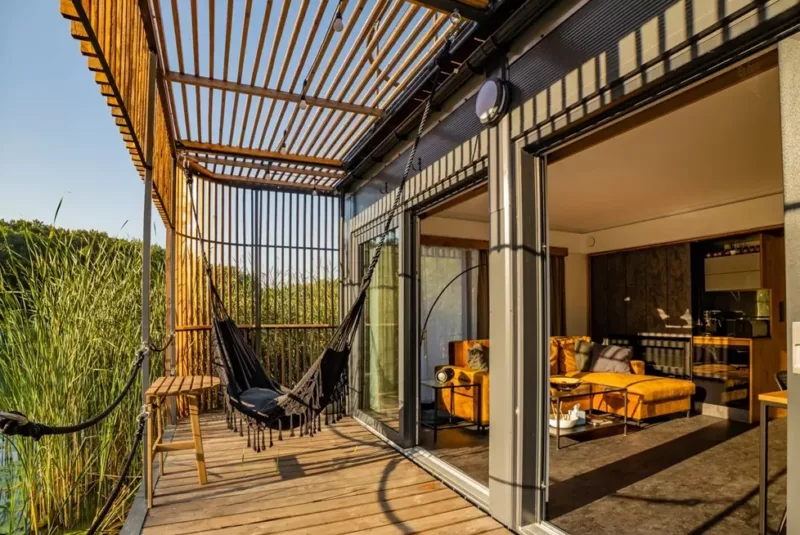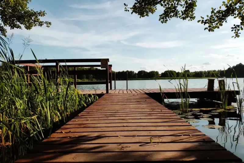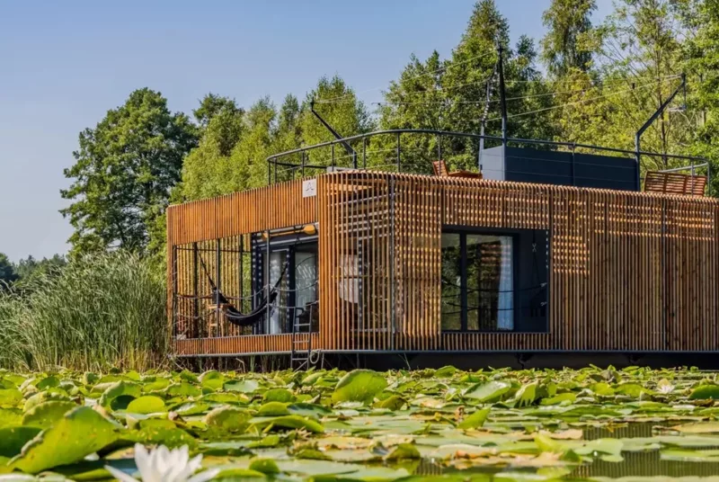 Wodna Kryjówka w Dzikiej Naturze to propozycja dla tych, które chcą świętować wieczór panieński w wyjątkowej scenerii – na tafli jeziora, pośród drzew i śpiewu ptaków. Dwa domki przycumowane do pomostu na Jeziorze Nowowiejskim otoczone są lasem i trzcinami, co gwarantuje prywatność i poczucie bycia naprawdę blisko Natury. 🌿 Co więcej, do dyspozycji Gości są sauna, bania z gorącą wodą, dachowe tarasy z leżakami oraz hamaki z widokiem na wodę.