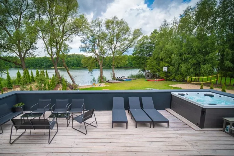 Willa na Mazurach to propozycja dla większej grupy przyjaciółek, które chcą świętować wieczór panieński w spektakularnym stylu – tuż nad jeziorem, z własną plażą i pomostem. Na terenie posesji czekają basen z barem wodnym, jacuzzi z widokiem na wodę, sauna oraz prywatna strefa relaksu. Co więcej, przestrzeń jest ogromna – dom pomieści ponad 30 osób i oferuje wszystko, od sali kinowej po boisko i sprzęt wodny.