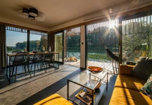 Każdy domek oferuje wygodną przestrzeń, taras z widokiem, kominek i w pełni wyposażoną kuchnię. Ponadto możecie korzystać z rowerka wodnego, łódek, hamaków i miejsca na ognisko. To miejsce stworzone na odpoczynek, śmiech i wspólne celebrowanie ważnych chwil.