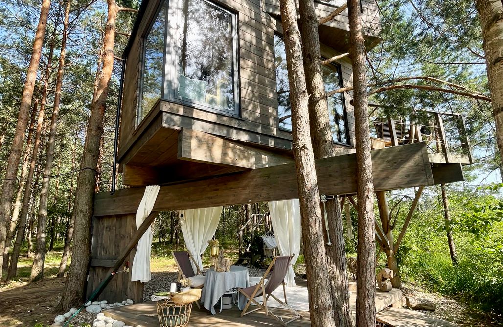 Discover the magic of life in the treetops just 20 minutes from the center of the capital city Immerse yourself in the unique world of My Tree Home, where two luxury tree houses have been built in the heart of the Macier Swamp - a unique wildlife enclave in Warsaw's Stara Milosna. This extraordinary accommodation in the forest combines proximity to Nature with the highest standard of facilities, creating the perfect place for a romantic weekend for two, away from the hustle and bustle of the city. Each of the year-round cottages has been designed with maximum comfort and privacy for adult guests in mind. Handcrafted, multi-functional furniture, designer bathrooms with heated floors, bio-fireplaces and panoramic windows create an atmosphere of luxury in a natural setting. Large treetop terraces offer unique views of the surrounding forest and allow you to fully appreciate the magic of this unique place. The private land of over 6 hectares, located on the edge of the Mazovian Landscape Park, guarantees peace, quiet and the opportunity to observe wildlife. The unique microclimate of the bog provides crystal clear air, and the presence of protected lichen species confirms the ecological value of this place. Luxury and comfort in harmony with Nature You can choose between two exceptional houses: the larger Tree Home VILLA and the intimate Tree Home NEST. Both are equipped to the highest standard - you'll find built-in Bluetooth speakers, remote-controlled lighting, a Nespresso machine, and carefully selected accessories that emphasize the luxurious character of the place. You'll start each morning with breakfast delivered to your door in a wicker basket. A wooden footbridge leads to a communal area with a fire pit and high-end Weber grill, where you can spend the evening under the stars. The year-round swimming pool is an added attraction - in summer it offers refreshment after a walk in the woods, and in winter a chance to practice walruses for the brave. Cleverly designed furniture with pull-out tables and hidden storage maximizes the use of space while maintaining an elegant design. Wildlife at your fingertips The location, despite being in Warsaw, allows you to quickly escape from the hustle and bustle of the city - it takes only 20 minutes to get there by car, and by public transportation you can take the 147 bus. Despite its proximity to the capital, you will find yourself in the heart of wild nature, home to moose, roe deer, wild boar, cranes, white egrets and black-backed woodpeckers. Surrounding biking trails offer opportunities for active recreation, and horseback riding in the countryside is available for advanced riders. Walks on private land allow for "forest bathing" and digital detox, so necessary these days. Observation of nature becomes a daily pleasure here - every day can bring an encounter with the inhabitants of the forest. Proximity to the lake and numerous walking paths make every moment spent at My Tree Home a unique experience. This is a place where time passes more slowly and Nature surrounds you with its healing power. Practical information for the perfect stay My Tree Home is for adult guests only, which guarantees an atmosphere of peace and relaxation. The property does not accept pets, preserving peace and quiet for all residents of the forest. Check-in is possible from 15:00 and check-out by 12:00. The owner, Karolina, a psychologist by training, created the place out of her passion for Nature and her desire to share its healing power. She is happy to help organize surprises for a loved one - My Tree Home is the perfect place for an engagement or anniversary. The history of the establishment of the facility in a challenging swampy area is proof that dreams can be realized against the odds.... Romantic, top-of-the-line furnished year-round homes in the treetops are a place of tranquility and relaxation for adults. Bathrooms of unique design, bio-fireplaces, terraces, handcrafted furniture and plenty of details that make every stay special. The property is for adults only, pets are not accepted.